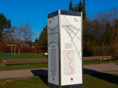 Der Sonnenuhrturm aus Edelstahl und Glas hat nach den vier Himmelsrichtungen ausgerichtete Zifferblätter. Bei Sonnenschein zeigen meist zwei der Sonnenuhren die Zeit an.